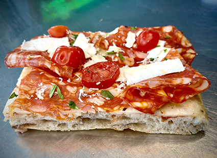Seznam alergenůSauce tomate, Spianata (salami piquant), Mozzarella, Origan, Ricotta affinée, Tomates cerises